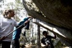 Cette fin d’après-midi a aussi été l’occasion pour certains de mettre les chaussons pour tâter un peu de ce caillou tout propre. Notre bel ambassadeur Hugo Parmentier est allé se ruiner les biceps dans son projet du moment La fête de l’insignifiance, sur le bloc de l’Insoutenable légèreté de l’être, une ouverture historique à l’Isatis. Cette session de calage en compagnie du phénomène local Charles Albert semble avoir été productive : Hugo réalisera ce 8b+ — son premier ! — deux jours plus tard ! Bravo à lui ! Charles s’est quant à lui consciencieusement décapé la peau des doigts et des orteils sur son projet du moment, un départ assis d’un des blocs les plus mythiques de la forêt. Affaire à suivre…